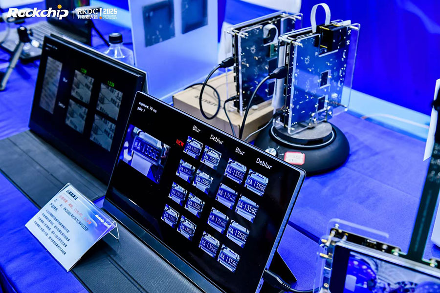 机器视觉展区,瑞芯微智慧视觉芯片产品矩阵首次完整展出,包括通用型AI芯片矩阵RV1126B,经济型视觉AI芯片RV1103、RV1106 RV1103B RV1106B,旗舰型视觉AI芯片RK3588、RK3576以及后端智能处理芯片RK182X、RK3588、RK3568、RK3576,以及瑞芯微核心自研技术包括AI-ISP、黑光全彩、AI降噪、AOV低功耗快启、智能压缩编码、AI检测、去运动模糊、动态拼缝、双目融合拼接、数字防抖等。