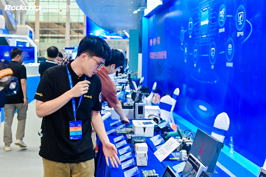行业应用展区,展出了一系列搭载瑞芯微芯片的工业、电力、医疗、教育设备、网络数通等终端产品为代表的新质生产力成果和技术,从入门级到高端产品,瑞芯微提供多阶方案配置,灵活选型;端侧AI加持,从边缘计算到多模态大语言模型,可适配更多元的应用需求;配备丰富的接口,扩展性优异;工业级别可靠性,提供实时保障。